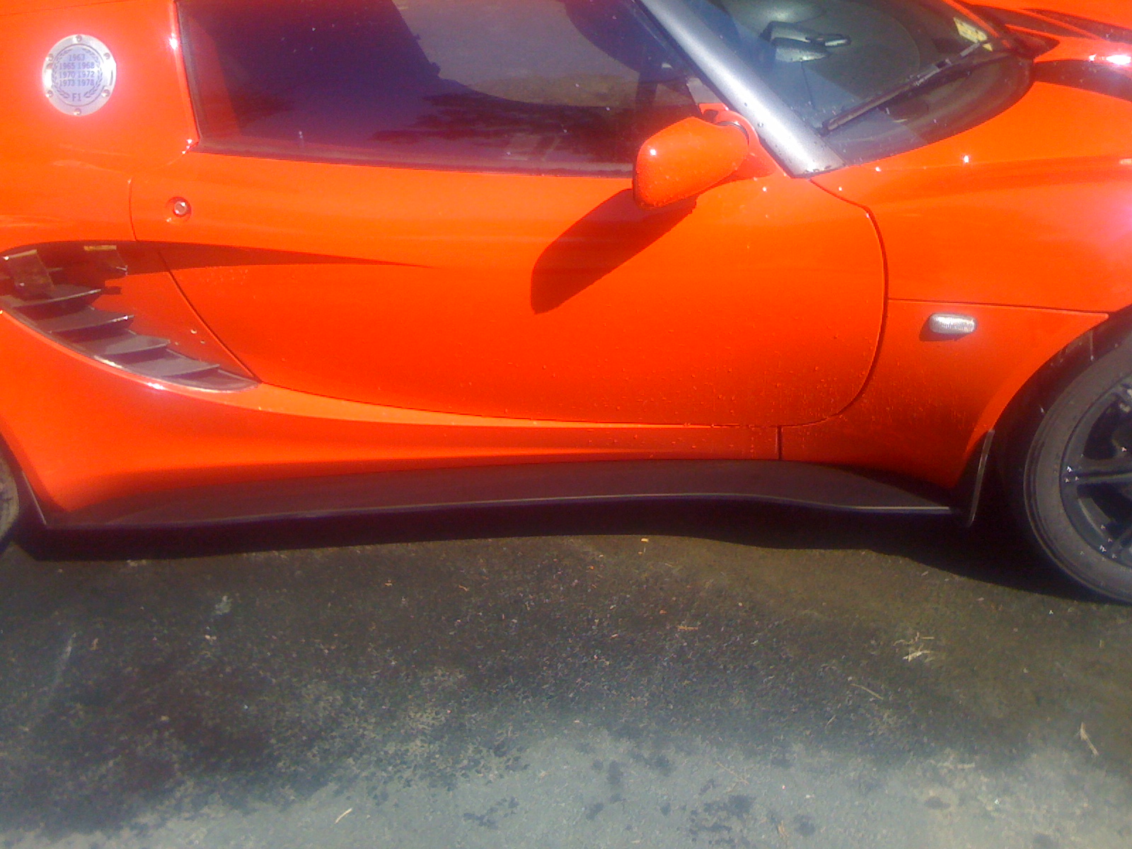 some pictures. Pictures of the upcoming Lotus Elise Side Skirts. I decided to make these because I looked at the different side skirt options out there and liked something from each so I decided to design my own. The attached to the bottom of the Elise with some rivets and a carbon fiber piece in the back. They weight 2.5lbs each so it is nothing to worry about. I also made a larger passenger side scoop. I did this for better air flow and I wanted a scoop that will look really good. It sticks out 1.25" farther than the stock Exige side scoop and looks awesome, it just not painted yet so not pictures yet. I also am not a big fan of are the bolts to hold it on. The one I have made will have internal bolts so it will have a smooth outer surface. I have only made the passenger side so far and once done I will make a drivers side scoop, then a new rear diffuser. I might make a new front splitter that is a little wider on the sides, we will see. After painting. The pictures are not good. I took them from my iphone and it was raining out. When there is a sunny day I will take some better pictures. They do look really good in person. I wound up just riveting them onto the body with about 10 1/8" rivets. It also do not effect how you get in and out. I was worried about that. Now I just have to get a sticker and put no step on it. My new bike rack. I got tired of not being able to drive my car when it was a